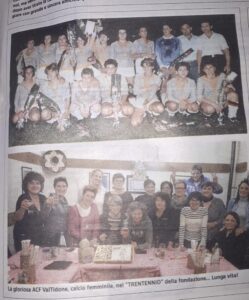 Se una sera di primavera, vi trovaste dalle parti della Valtidone (Piacenza), potreste incappare in un gruppo di signore (un dozzina) che in occasione delle celebrazioni della Gallina Grigia (d’la Galeina Grisa) si ritrovano, come tutti gli anni a celebrare ricordi calcistici. Non dei loro fidanzati o mariti, ma di quando giocavano nella gloriosa ACF Valtidone. Tutto è  cominciato nel 1988 con un torneo a sei a Trevozzo, in un campetto che oggi è un parcheggio. A raccontare questa storia a Bruno Contigiani è Fabrizio Buccellini, che della squadra è stato fino alla fine di questa esperienza, nel 1994,  l’allenatore, con trascorsi personali di calciatore come difensore o centravanti a seconda di come andava la partita, milanista come me. Prima che Megan Rapinoe diventasse la calciatrice più famosa, e prima che il calcio femminile venisse scoperto dai maggiori team italiani, da queste parti, come del resto in tante cittadine o comuni della provincia italiana si praticava un calcio femminile a un buon livello, in gran parte autofinanziato e con l’aiuto di piccoli sponsor, come il supermercatino Il Nibbio, o la Vetreria di Borgonovo, che mettevano a disposizione il pulmino per le trasferte (Mascaretti) o che contribuivano alla produzione di un libretto pubblicitario o all’acquisto del materiale di consumo.