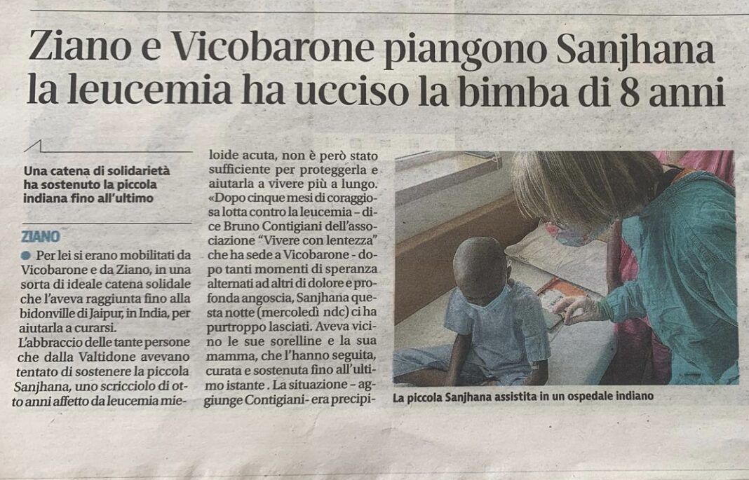 Condividiamo con voi che avete amato Sanjhana quanto noi, le magre consolazioni che servono a noi che restiamo e alle quali abbiamo bisogno di aggrapparci. Ecco il racconto di Kiran: “Dopo l’una di notte (per noi le 21,30 del 12 luglio) non ha avuto più dolori. Le stavano facendo una trasfusione di piastrine e ha … Leggi tutto Il racconto di Kiran – l’ultimo sorriso di Sanjhana