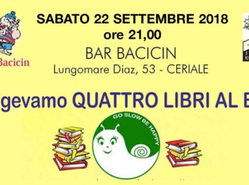 Sabato 22 settembre 2018 ore 21,00 torna al Bar Bacicin di Ceriale (Savona) la Leggevamo Quattro Libri al Bar. Organizzata dall’instancabile Maurizio Pupi Barcali, con la conduzione di Mario Mesiano e la partecipazione di Bruno Contigiani.